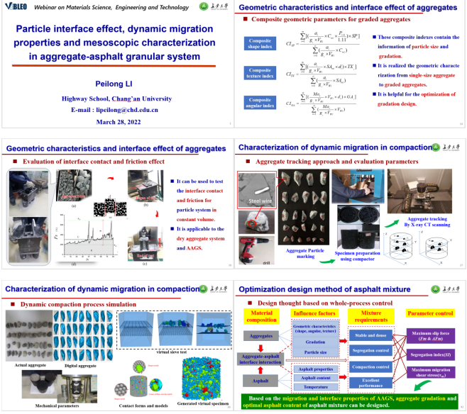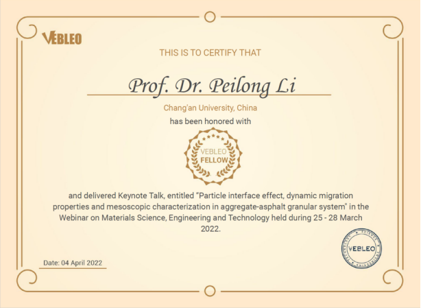 栗培龙教授被授予国际科学组织Vebleo协会会士(Vebleo Fellow),并受邀在Vebleo主办的科学、工程与技术网络研讨会(Webinar onMaterialsScience, Engineering and Technology)中做了主题为“Particle interface effect, dynamic migration properties and mesoscopic characterization in aggregate-asphalt granular system”的主旨报告(Keynote Talk)。栗培龙教授介绍了他和团队在沥青混合料微细观作用行为与机理、表征方法及工程控制方面做出的学术贡献,特别介绍了近年来基于矿料-沥青颗粒体系动态迁移的沥青混合料设计-生产-施工-服役全过程量化表征与控制系列成果。