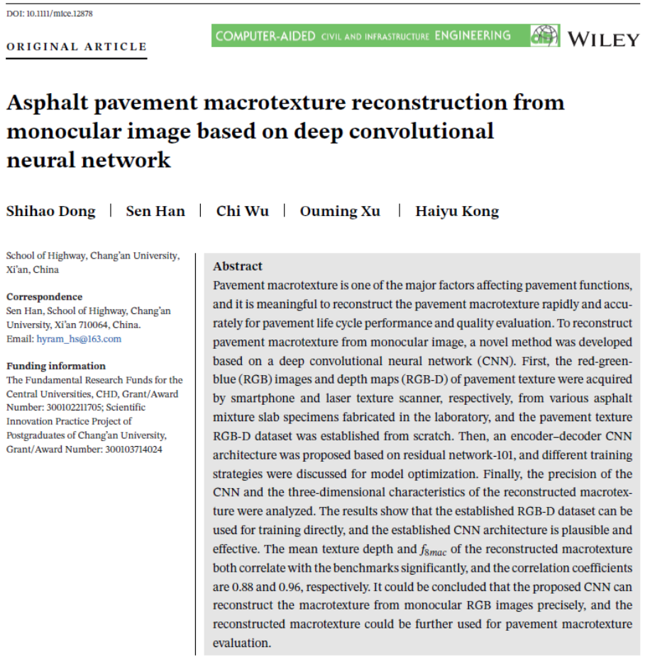 博士生董仕豪在导师韩森教授和徐鸥明教授共同指导下,在土木工程领域顶级期刊《Computer-Aided Civil and Infrastructure Engineering》发表研究论文“Asphalt pavement macrotexture reconstruction from monocular image based on deep convolutional neural network”( 基于深度卷积神经网络的单目图像的沥青路面宏观纹理重构)。