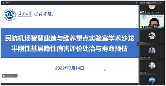 2022年7月14日下午,民航机场智能建造与维养重点实验室成功举办“半刚性基层隐性病害评价处治与寿命预估”线上学术沙龙。西北民航机场建设集团杨凯、圭目机器人有限公司钟新然、广西交通科学研究院王浩、休闲小栈