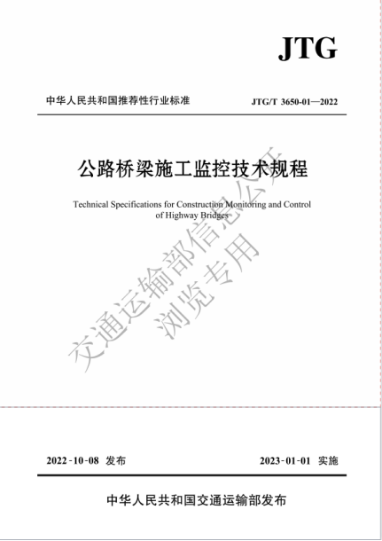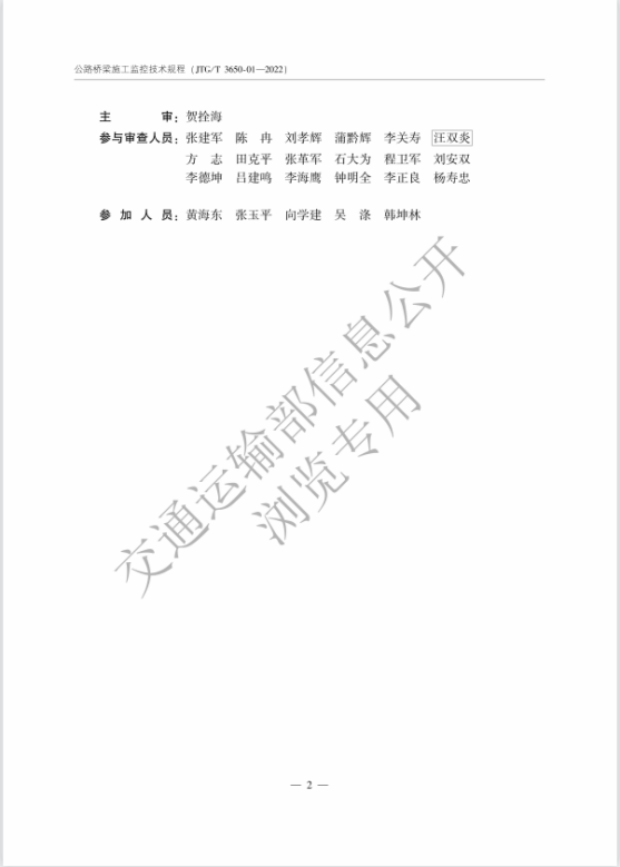 贺拴海教授主审,周勇军教授参编的交通运输部行业标准《公路桥梁施工监控技术规程》(JTJ/T3650-01-2022)于2022年10月8日正式发布,该规范自2023年1月1日起施行。