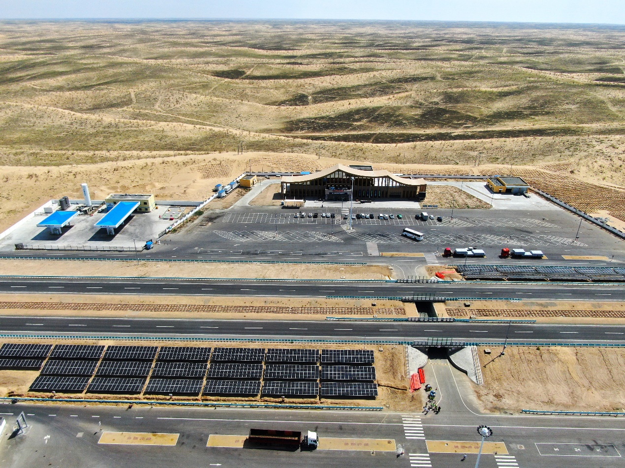 阿乌高速公路穿越中国第二大沙漠——古尔班通古特沙漠,北起新疆阿勒泰地区福海县,南至乌鲁木齐市。阿乌高速公路的路域风、光资源禀赋丰富,但是由于处于电网末梢,交通能源供给稳定性面临巨大挑战。研究团队系统评估了阿乌高速公路路域自然资源禀赋和交通用能负荷,选取地处沙漠腹地的克拉美丽服务区作为示范点,利用路域禀赋资源建设高速公路自洽能源系统。