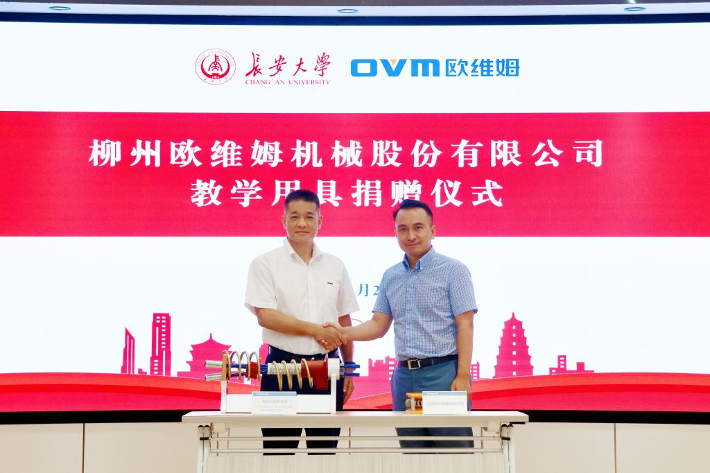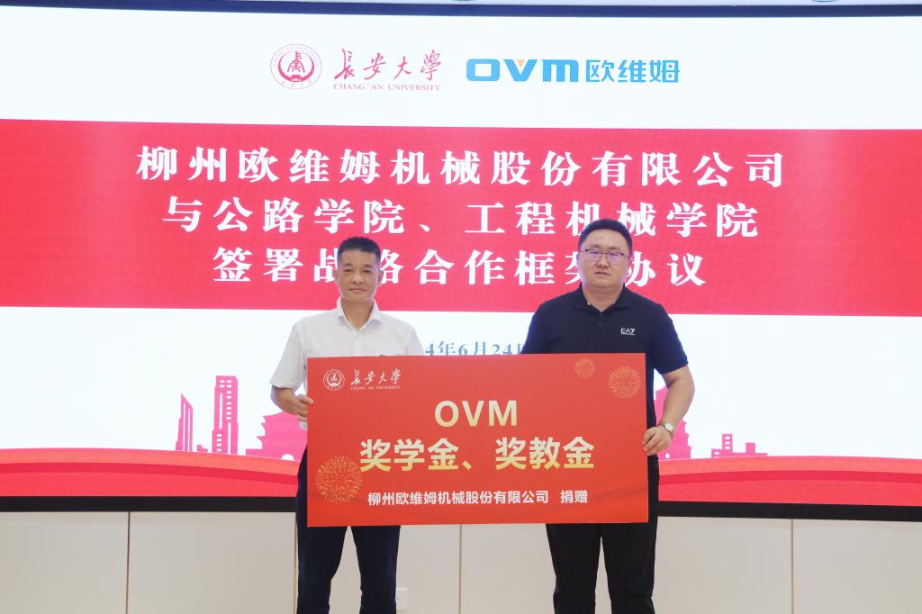 副院长韩万水、工程机械学院党委副书记雷剑分别接受了欧维姆公司捐赠的教学用具和奖、教学金。