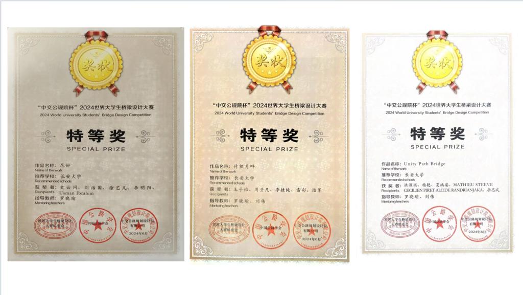 6月29日上午,“中交公规院杯”2024世界大学生桥梁设计大赛现场总决赛暨颁奖典礼在青岛举行,我院参赛作品斩获10项大奖。其中特等奖3项、一等奖1项、二等奖3项、三等奖3项,刷新了我院学子参加该赛事以来取得的历史最好成绩记录。