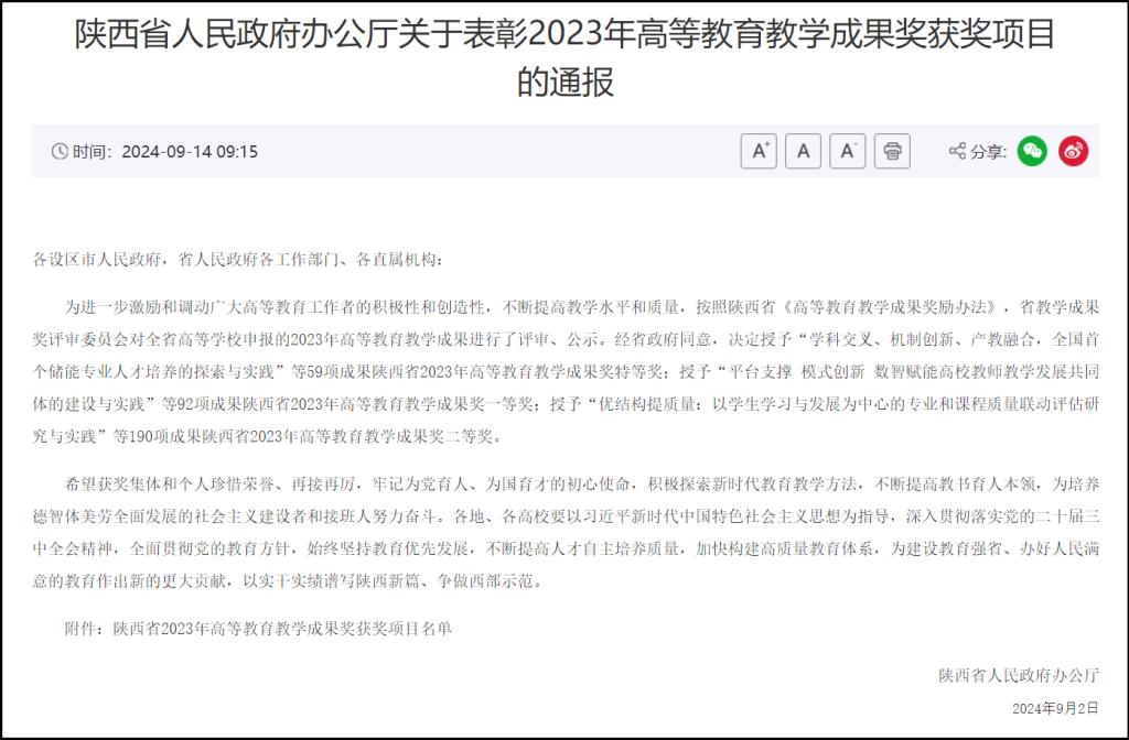 近日,陕西省人民政府发布《陕西省人民政府办公厅关于表彰2023年高等教育教学成果奖获奖项目的通报》(陕政办函〔2024〕104号),休闲小栈