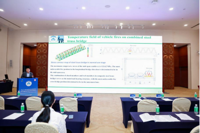 王世超博士就《Study on Residual Load Capacity of Combined Steel Truss Bridge after Vehicle Fire》进行了学术汇报,介绍了考虑桁杆变形效应和结构钢强度退化的组合钢桁架桥梁结构剩余承载能力评估方法,为桥梁火灾后的风险评估提供了科学依据。薛宇欣、王佳盈、焦晨凯等学生也进行了分会场学术报告。
