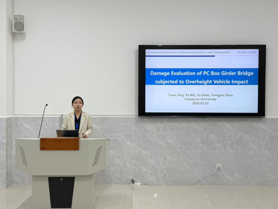 会议中,桥梁工程系景媛副教授以《Damage evaluation of PC box girder bridge subjected to overheight vehicle impact》为题进行了学术汇报,详细探讨了PC箱梁桥在超高车辆撞击下的动力响应及损伤评估方法,为桥梁在超高车辆撞击下的安全性能评估提供了重要科学依据,同时也为桥梁的抗冲击设计和安全保障工作奠定了坚实理论基础。