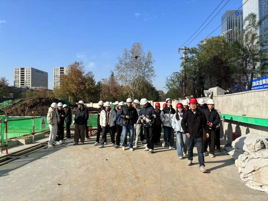 在输变电工程施工现场,同学们沿安全通道参观了包含深基坑在内的关键作业区域。专业技术人员结合现场实际,重点讲解了深基坑的支护形式、开挖流程、降水方法以及周边环境变形控制要求等内容。同学们围绕基坑稳定性、支护-土体相互作用、监测方法与安全控制标准等问题,与技术人员展开交流,进一步理解了深基坑工程在整体电力设施建设中的重要作用。