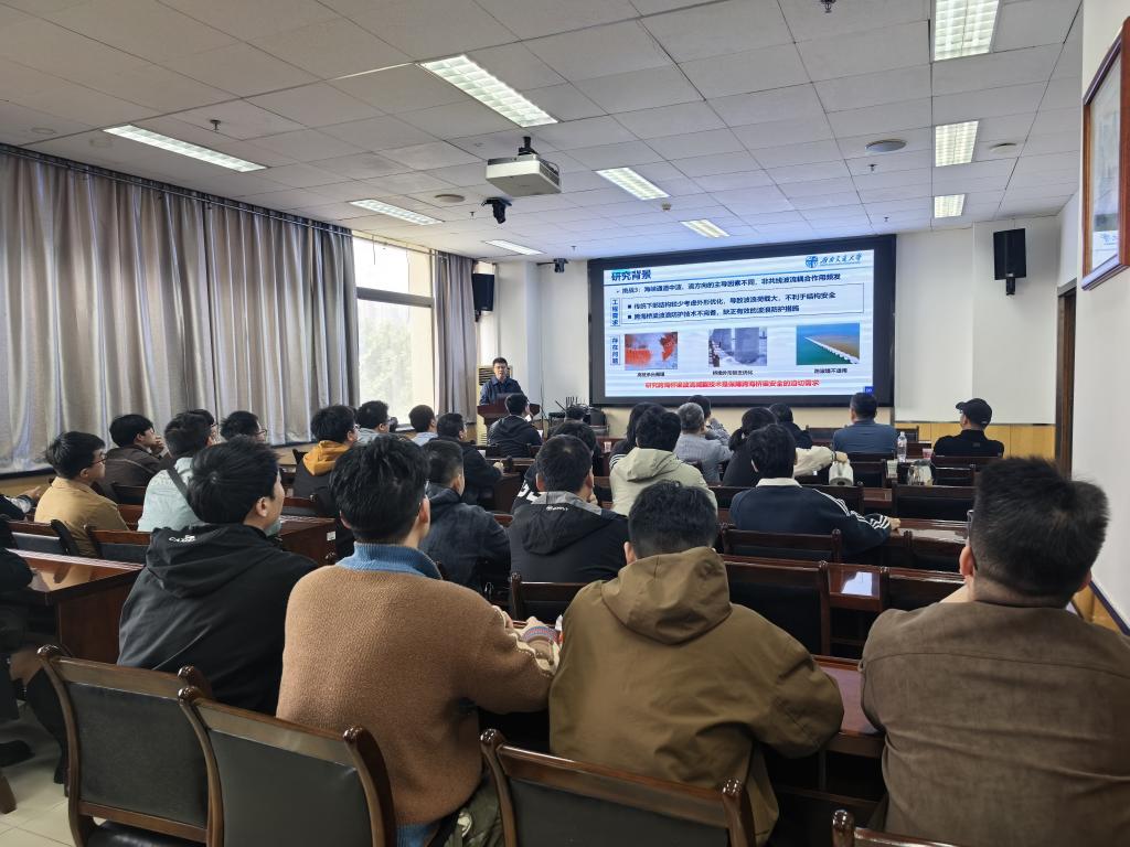 本次报告主要围绕海峡通道内强波-强流耦合场演变特性、非共线波-流空间耦合作用机理、桥梁波-流耦合荷载计算及动力响应分析、基础结构波-流荷载减控技术等四个方面展开。报告会上,魏凯教授从大型海峡通道建设的工程需求出发,针对“狭管效应”下跨海桥波-流空间耦合作用难题,系统介绍了波-流场的时空演变表征方法、非共线波-流耦合作用机制及桥梁结构动力响应分析的研究现状,展示了桥梁智能与绿色建造全国重点实验室多功能桥梁波流实验池的设计特点与研究优势,分享了相关技术在西堠门大桥、琼州海峡跨海等工程的应用案例。他鼓励同学们要立足国家战略需求精确选题,善用学科交叉视野破解工程难题,更要持之以恒、精益求精,以恒心与细心筑牢通往未来的桥基。