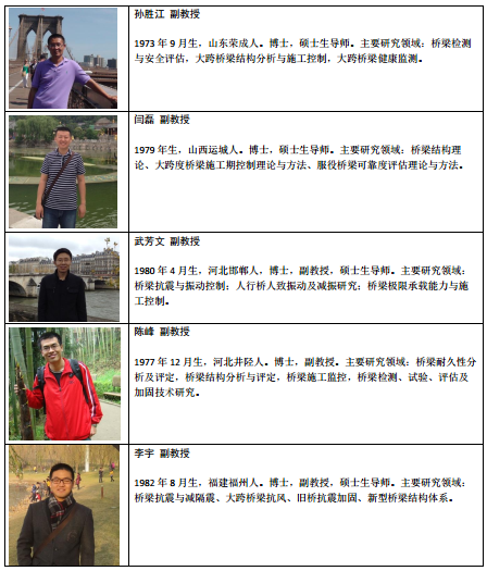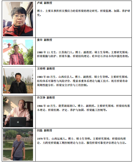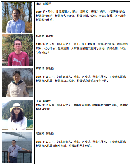 桥梁工程学科依托土木工程、交通运输工程一级博士点和博士后科研流动站,设有桥梁结构安全技术国家工程实验室、交通运输部旧桥检测与加固技术交通行业重点实验室、公路大型结构安全教育部工程研究中心和陕西省公路桥梁与隧道重点实验室,用于风工程研究的风洞实验室,桥梁环境模拟实验室和桥梁结构抗火实验室(在建中)。研发场地及办公面积6000余平方米,各种大型试验仪器设备和研发计算平台价值3000余万元。现有教师60余人,其中博士生导师11人,教授19人,副教授27人。能够进行大型桥梁结构的静动力模型试验、疲劳与耐久性、抗震与抗风、施工监测与控制、检测加固及实桥荷载试验和分析计算。近五年来出版学术著作20余部,制(修)订规范10余部,发表学术论文200余篇,获国家科技奖励2项,省部级奖励30余项,先后完成了多项国家、部省级及重大工程科研项目;完成了包括港珠澳大桥、杭州湾大桥、青岛海湾大桥、舟山连岛工程等著名桥梁在内的近千座桥梁工程的科学研究、施工控制及承载力试验和包括广州海珠大桥、石嘴山黄河大桥等在内的近百座桥梁工程的加固设计与施工技术指导工作。
