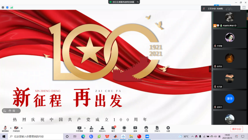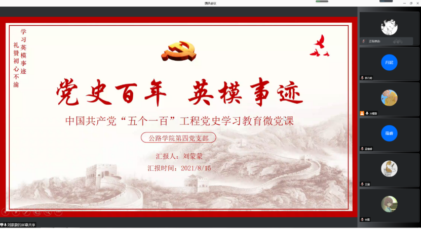 本科生第四党支部于8月15日通过腾讯会议开展了“党史百年,英勇事迹”主题微党课党史学习,本次会议由组织委员刘蒙蒙主讲、党支部副书记方耀萱主持。在党课学习中,刘蒙蒙同志为同学们讲述了毛泽东、刘少奇、周恩来、朱德等英模人物的辉煌事迹,再现了革命路上先辈们的艰辛与不易。同时,刘蒙蒙同志也强调,在建党百年这一重要的历史时间节点上,我们更应守好党的初心使命,永远铭记先烈们的英勇事迹,以史为鉴、开创未来。