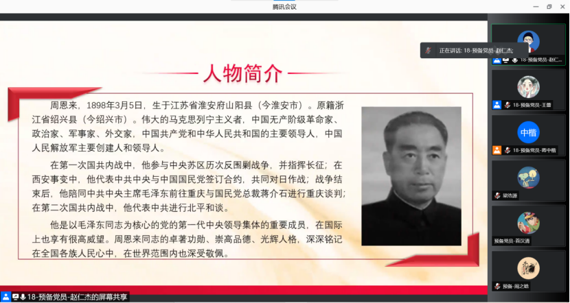 本科生第五党支部与8月14日通过腾讯会议开展了“五个一百”党史学习教育,本次学习由第五党支部组织委员赵仁杰同志主持。会议上,赵仁杰同志向同学们分享了一则周恩来同志的故事,从事迹中体现了以周总理为代表的老一辈革命者廉洁自律的优良品质。同时,赵仁杰同志号召全体同志向先辈学习,牢筑思想防线,强化党规党纪意识,努力让自己成为又红又专,德才兼备的中国特色社会主义事业合格建设者和可靠接班人。
