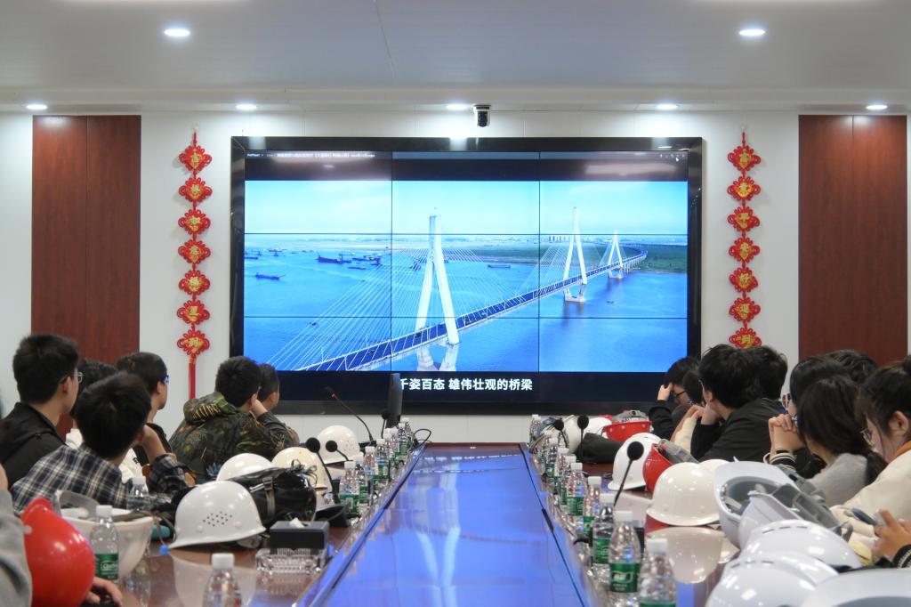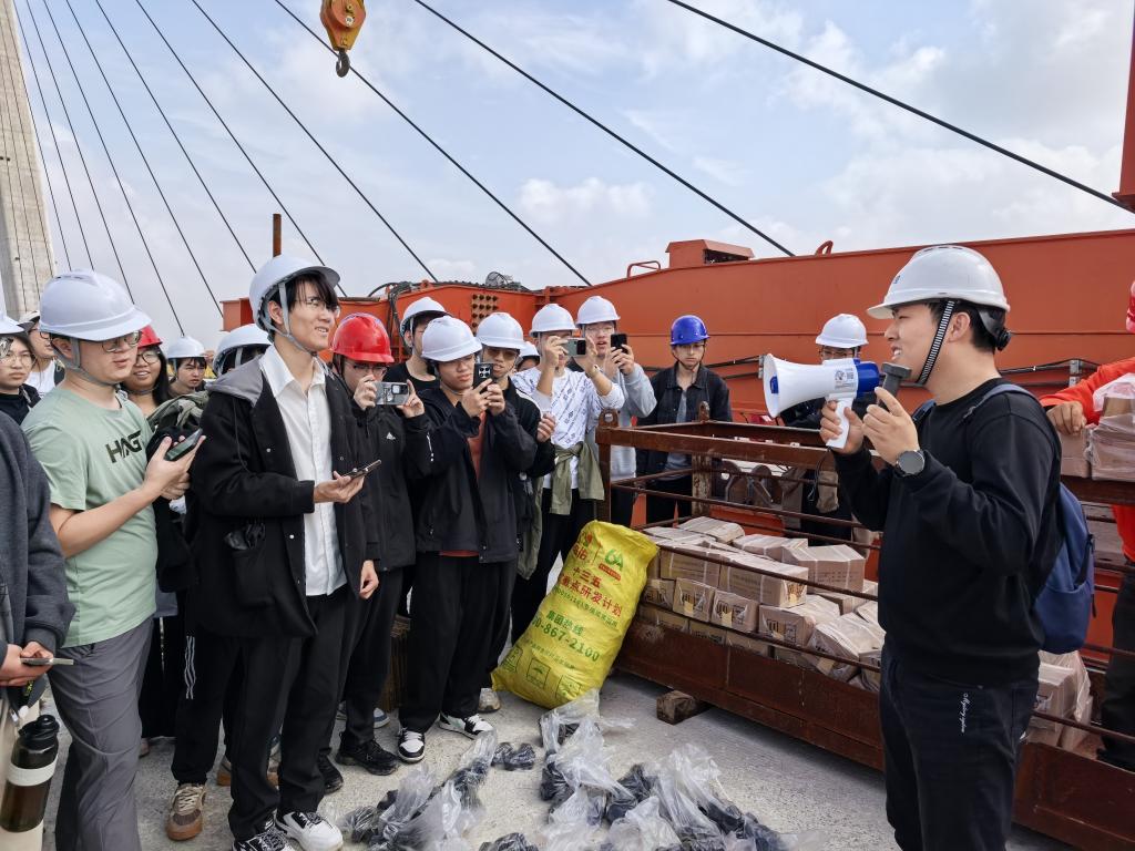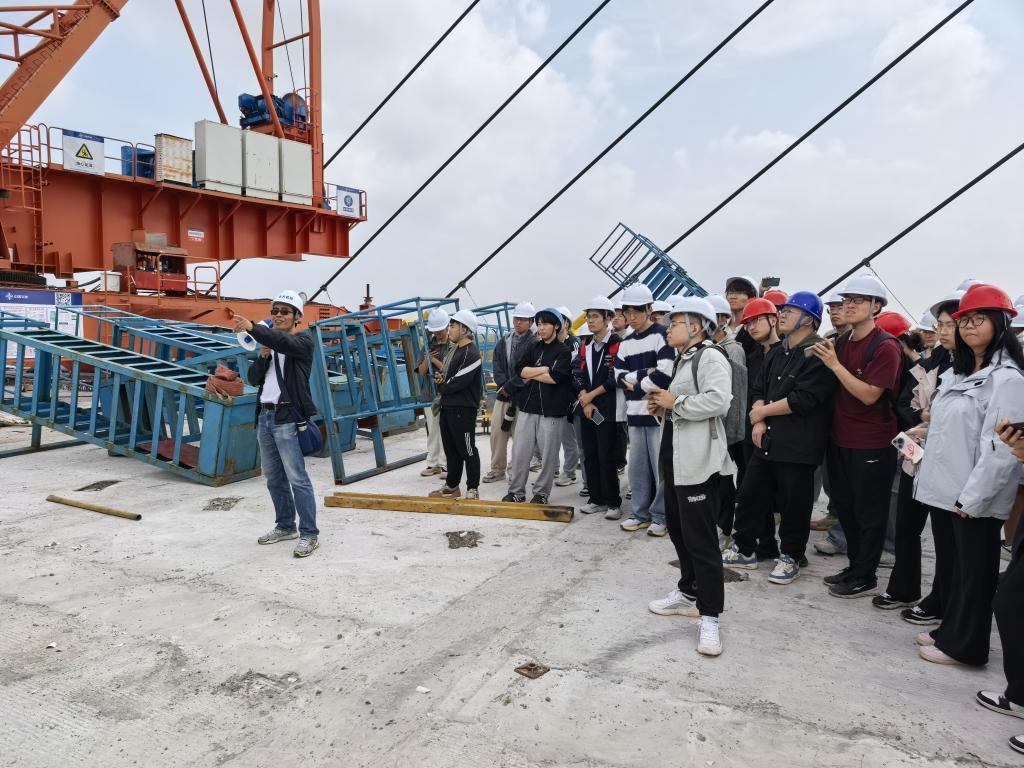 10 月 13 日至 14 日,师生走进松滋河特大桥南北两岸施工现场,邀请中交二航局总工程师刘瑞现场讲解桥梁上部结构施工、预应力张拉技术等核心内容,引导学生深入了解工程安全管控、资源调配与工期保障的协同逻辑。10 月 15 日,实习师生探访由湖南路桥建设集团承建的世界最大跨径公路斜拉桥观音寺长江大桥,邀请项目部副经理邓飞凡、总工程师杨新湘围绕超大跨度斜拉桥的结构设计、主跨施工工艺等前沿技术展开深度学习。10 月 16 日至 17 日,师生赴枝江百里洲长江大桥(世界最大跨度钢-UHPC组合梁斜拉桥)北岸施工现场,在中交第二工程局项目部总工程师陈杰的指导下,现场观摩学习斜拉索挂索和主梁吊装架设工艺。10 月 18 日,邀请驻地监控周豪老师,围绕大跨度斜拉桥监控内容、细节流程开展专题报告。实习中,陈峰、刘江等带队教师同步衔接课堂理论,针对现场施工工艺抛出专业问题,引导学子将桥梁结构原理、内力计算方法、桥梁施工技术与工程实体精准结合。