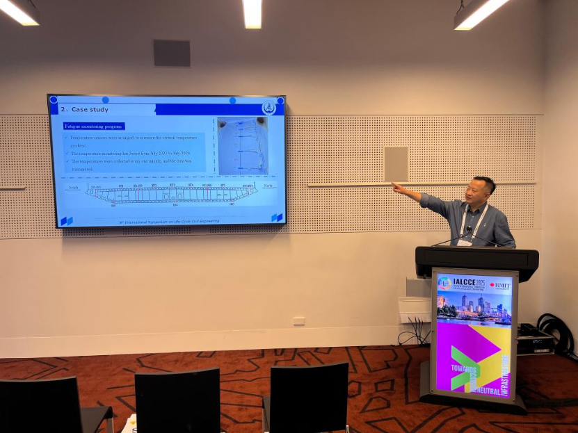 In the academic session, Professor Wang Chunsheng chaired the sub-forum on "Lifecycle Design for Structures and Infrastructure" and delivered two presentations: "Study of Thermal Gradient Fatigue Load Model for Flat Steel Box Girder Bridge" and "Mechanical Performance Simulation of Steel-Concrete Connection Section of Composite Bridge Tower." Associate Professor Duan Lan presented her research titled "Hybrid Connecting Interface Optimization for UHPFRC Composite Steel Bridge Deck," while doctoral student Li Xi shared findings on "Bending Performance of Composite Steel Plate Girders with Corrugated Webs." These four presentations systematically introduced the team’s latest advancements in the field of long-life bridge design, attracting significant attention from conference experts.