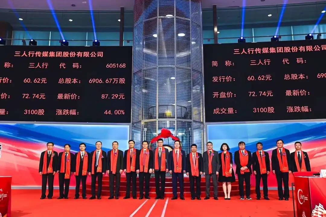 2020年5月28日,三人行传媒集团股份有限公司成功登陆上交所主板。陕西省委常委、宣传部部长牛一兵,陕西省地方金融监督管理局局长苏虎超,西安市委常委、宣传部部长张琳,西安市人民政府党组成员、副市长王勇,兴业证券股份有限公司董事长杨华辉与三人行传媒集团董事长钱俊冬一起,在上海证券交易所上市仪式大厅共同鸣锣开市。