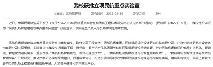 牵头、中心副主任汪海年教授负责的“民航机场智慧建造与维养重点实验室”获批立项。